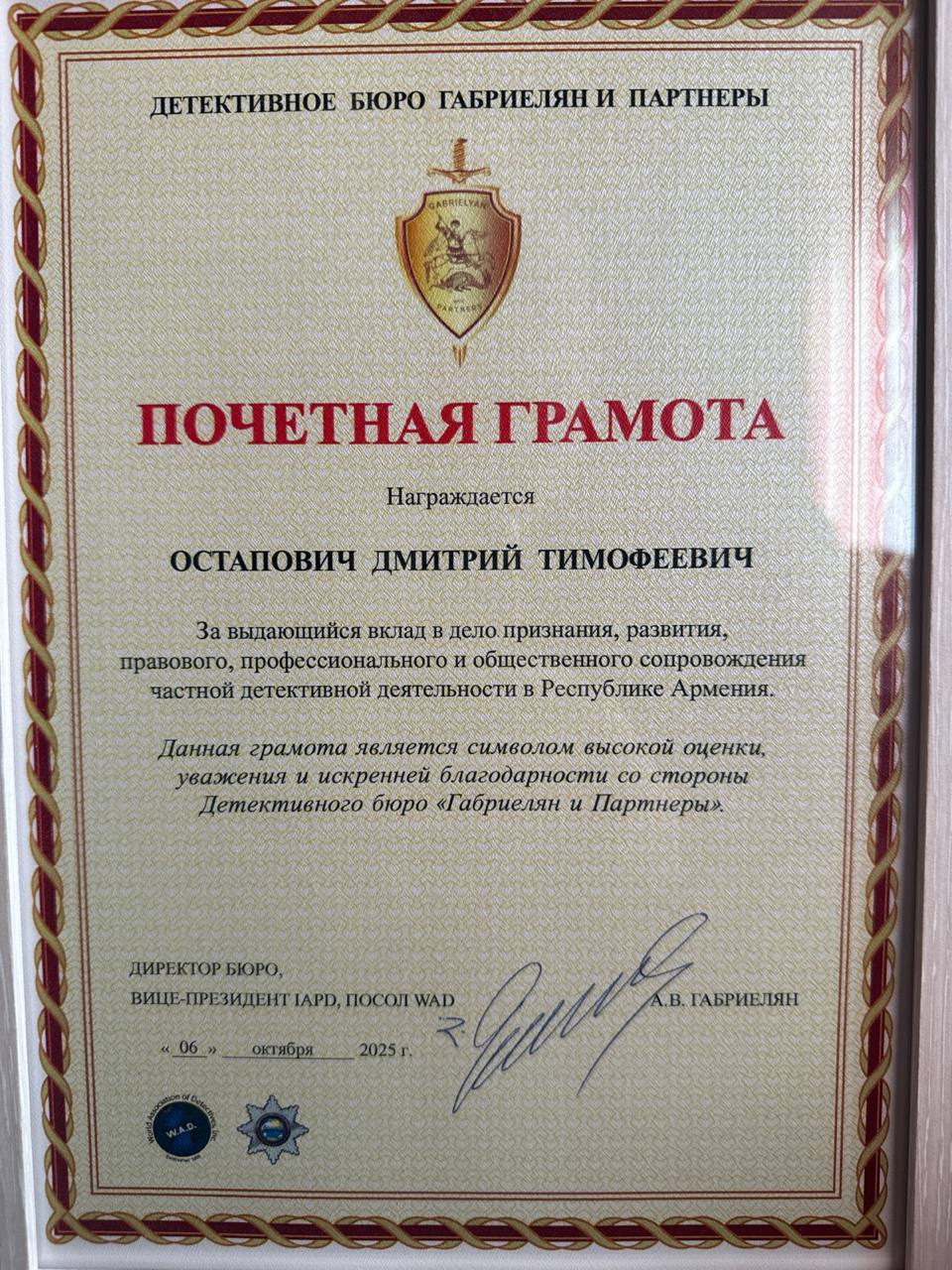 В октябре 2025 года основатель и руководитель группы компаний Агентство Безопасности Бизнеса Дмитрий Остапович принял участие в ежегодной конференции Международного объединения детективов, которая в этом году впервые прошла в солнечном Ереване, столице Армении.